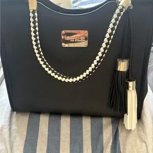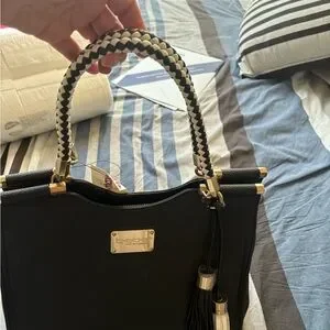 Elegant BNWT Bebe Los Angeles black and white leather handbag with braided handle and tassel accents plus crossbody strap . Perfect for any occasion.