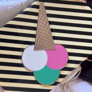 Dust bag included. Stylish clutch with bold stripes. Features a colorful ice cream cone design. Perfect for adding fun to any outfit.