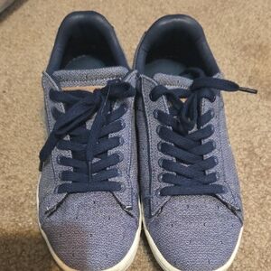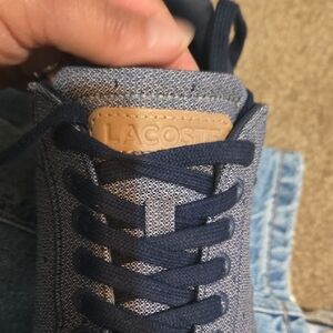 Used Navy athletic shoes with tan heel detail. Features iconic Lacoste logo. Perfect for casual outings.