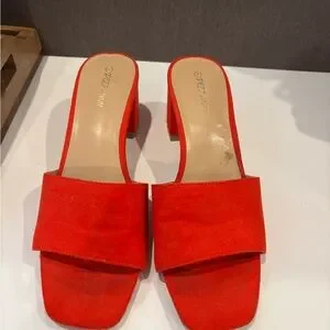 The perfect block heel and pop of color! Step out in style with 's vibrant red slide sandals. Perfect for any occasion, these shoes offer both comfort and elegance.