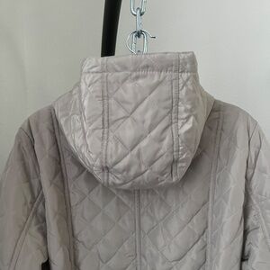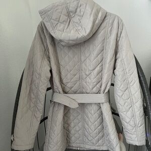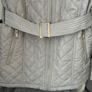 Beautiful belted quilted coat with hoody in gray and accent with gold tone hardware. Features 2 front zipper pockets and zipper closure front center. Great for Fall & Winter.
