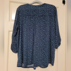 Elegant dark green blouse with white/brown speckles. Features a V-neck and three-quarter sleeves. This top is very flattering. The material falls beautifully on the body and does not cling. Beacon brand sold through Stich Fix. Very good used conditon with no signs of wear tear.