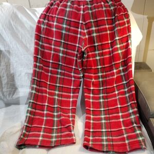 Cozy red plaid pajama pants with a drawstring waist. Perfect for lounging. The size tag was cut off, but I would guess that this is an XL. Non-smoking home. Very good condition. No flaws except for the size tag.