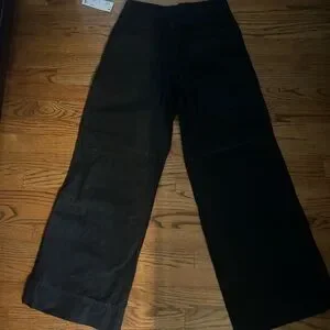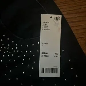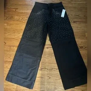 Size 0 wide leg black jeans with rhinestones. High quality, thick material, new with tags. Runs true to size. I am 5 foot 4 and they are just long enough to wear with sneakers or heels.