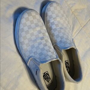 Classic Vans slip-ons with a subtle gray checkered design. Comfortable and stylish for everyday wear.