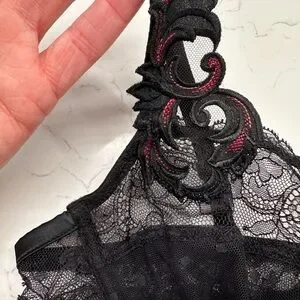 • Details: Luxurious Leavers lace meets delicate plumetis tulle, finished with fine feminine embroidery and a tiny jewel accent. Sheer, sensual, and effortlessly elegant — designed for a captivating silhouette.