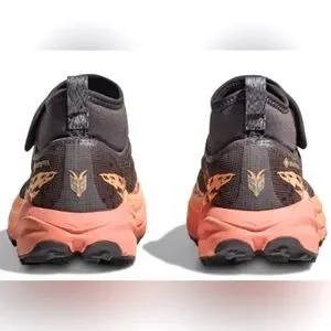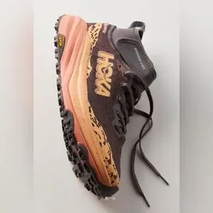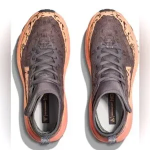 Stylish Hoka athletic shoes. Brown upper with orange accents. Perfect for running and training.