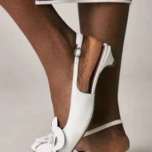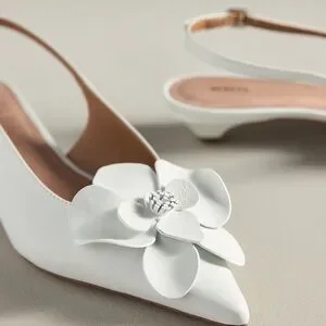 Elegant white heels with floral embellishment. Slingback design for comfort. Designed by Maeve from Anthropologie