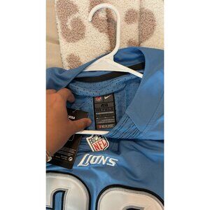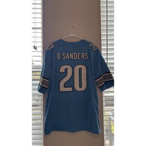 The product is a Nike Barry Sanders #20 Detroit Lions football jersey in men's size large. This officially licensed NFL jersey in blue features the iconic player's name and number, making it a must-have for fans of the Detroit Lions and football enthusiasts alike. Perfect for wearing during regular season games or as a stylish casual outfit, this jersey is a great addition to any fan's collection.