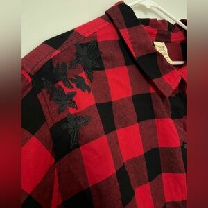 Casual button-down flannel with classic plaid pattern featuring black floral embroidery on shoulders. Ideal for everyday wear. Features a chest pocket.