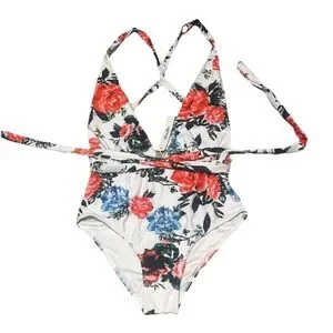 Brazilian women’s *S Low Plunge Front one piece floral swimsuit multiway tie NEW