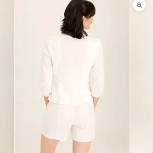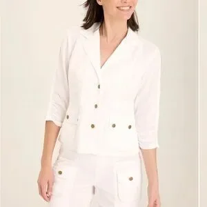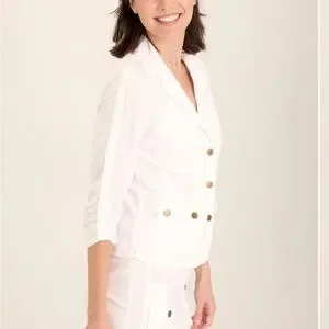 Linen stretch 4 pocket white women's jacket. Jacket back side rib stretch panels for a comfortable fit and slimming silhouette. Perfect for any occasion. Shirred sleeve. Perfect linen jacket, a must!