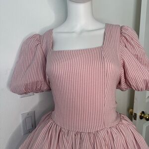 Charming pink striped dress with puff sleeves. Perfect for any occasion.