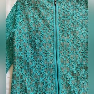 Very Elegant DKNY Turquoise lace dress with a beige or nude lining underneath.
