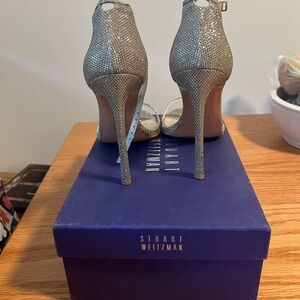 Elevate your style with these stunning Stuart Weitzman high heel sandals. Featuring a shimmering silver color, these shoes are perfect for any elegant occasion. Experience comfort and luxury with every step. Can provide more pics, just ask :-)