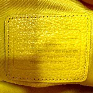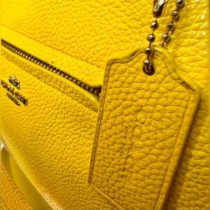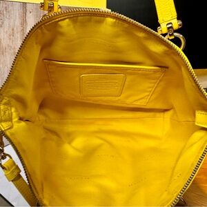Features: Outside zip pocket, Inside zip pocket, Zip-top closure, silver hardware, adjustable crossbody strap, matching yellow coach hang tag.