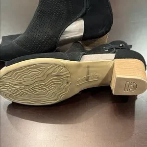 Elegant black heeled boots with peep-toe. Features perforated design. Ideal for versatile styling.