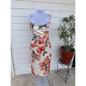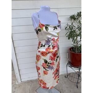 Elegant floral midi dress by Vera Wang. Features a cream base with vibrant red, pink, and purple flowers. Perfect for any occasion.