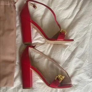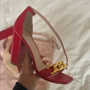 Bold red heels with striking gold chain detail. Perfect for a chic look.