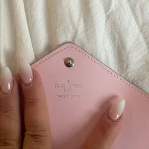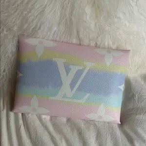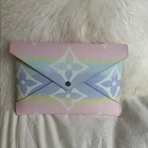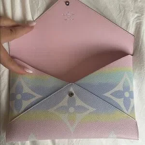 Chic Louis Vuitton clutch with pastel hues. Features iconic monogram pattern. Perfect for stylish outings.