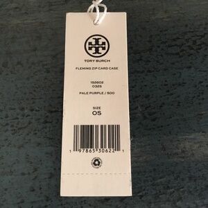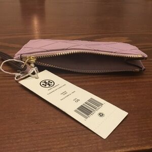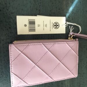 This “Fleming Zio Card Case” by Tory Burch is in a color called pale purple, but it could also be called lavender. The front has a raised diamond pattern and the back has 4 slip pockets for cards. It also has a zipper across the top of a pocket for