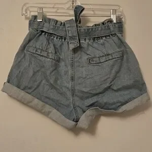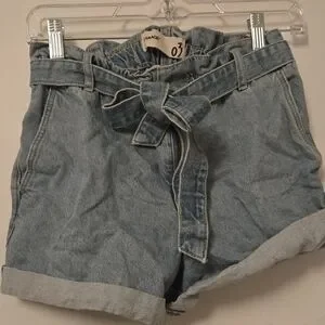 Trendy light blue jean shorts with a stylish tie belt. Perfect for casual wear.
