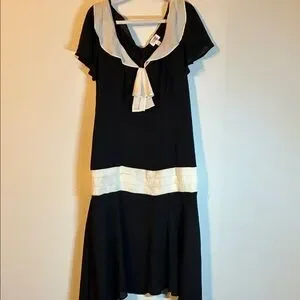 Chic high low dress with a black base and cream accents. Features a stylish neckline and flowing design.