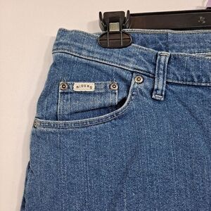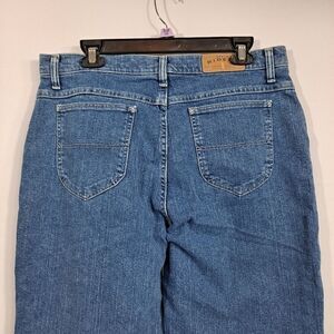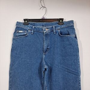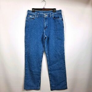 In great condition! Medium blue, size 16. Zip front, classic 5 pocket style, straight legs. Waist is 36", inseam 28.5". 12" rise.