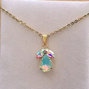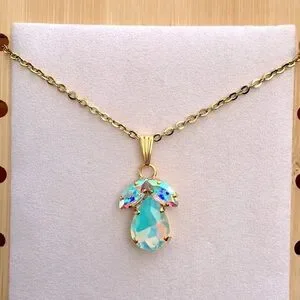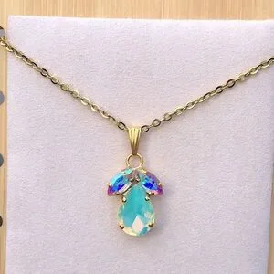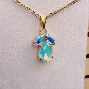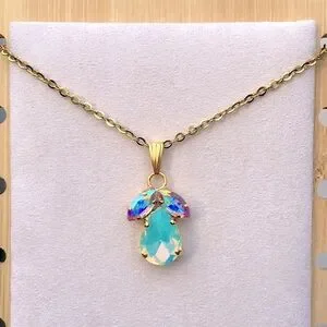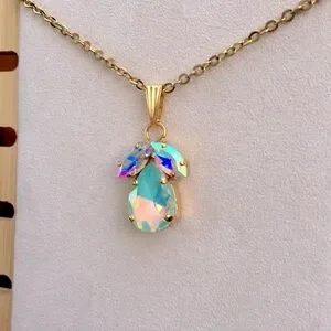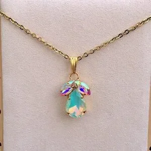 Green Opal Aurora Borealis + Gold Pear Marquis Crystal Pendant Drop Necklace