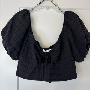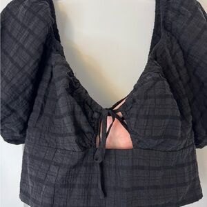 Stylish black crop top with puff sleeves. Features a tie-front detail. Perfect for a trendy look.