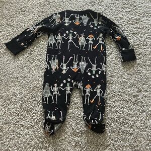 Charming black footie with playful skeleton design. Perfect for Halloween.