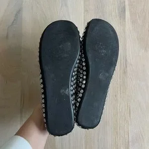 Chic and on trend, great with dresses, jeans, maxi skirts. Rounded toe. Flat. Unclosed. Sparkly decorative appliqués. Inner lining.