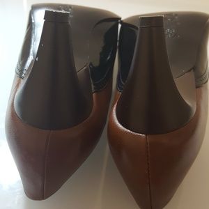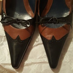 Black and Cognac Wingtips. Pointy Toe with tie bow at toe. Kitten heel ~2.5"