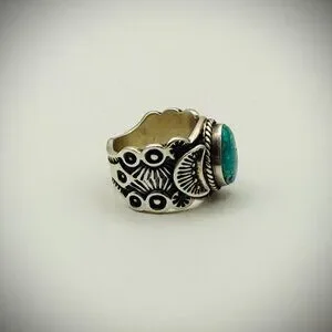 Statement Navajo ring by award-winning silversmith Sunshine Reeves. Heavy, scalloped cigar-band shank with Reeves’s deep, precise stampwork and a bezel-set turquoise cab. Substantial feel and great presence.