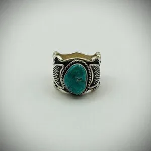 Stone: blue-green turquoise cabochon with dark matrix; based on color and Reeves’s typical materials, it’s most likely Kingman; untested mine origin