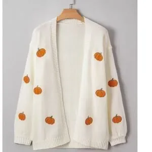 * This womens white cardigan with patched pumpkin pattern is perfect for fall.