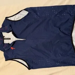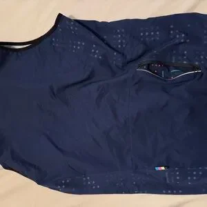 Stylish navy blue matching cycling vest, jersey, and bib. Features a zip-up front and short sleeves.