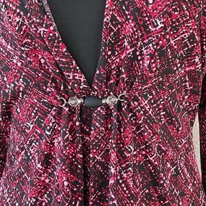 EUC Notations Womens Pink and Black Blouse Top Size M. This top features a jewel and bead tie in the middle and built in tank. It measures 19 inches armpit and armpit and 26 inches in length.