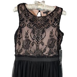 As U Wish Lace Cocktail Dress. Nude layer on the upper half with lace overlay. The bottom half has an elastic waist band with tulle layer. Keyhole in the back with button closure. 100% polyester.