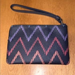 Stylish navy (black in most lighting) Coach wristlet with green, blue, purple, red, and orange zigzags.