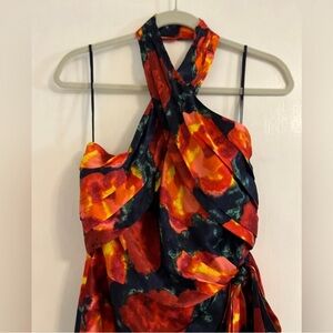 Bold floral mini dress with halter neck. Striking red and pink design. Perfect for standout style.