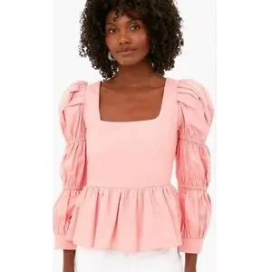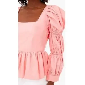 100% cotton, square neckline, long ruched puff sleeves, back zipper closure, peplum silhouette, approx measurements shown, coral pink colorway, minimally worn