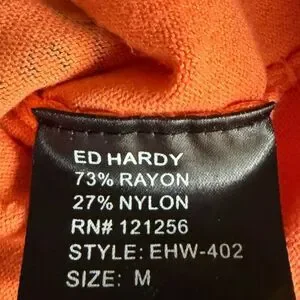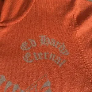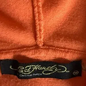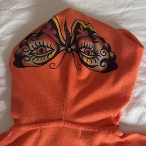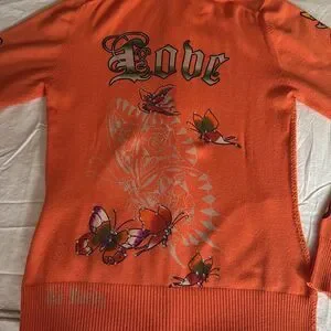 Ed Hardy by Christian Audigier woman’s full zip hoodie in orange with colorful butterflies with rhinestones on front, sleeves, back and hood. Features long sleeves with blanket stitching, full zipper closure, front pockets & hood.