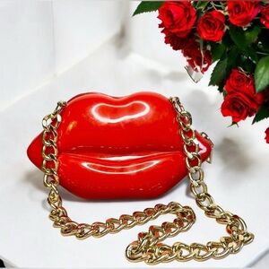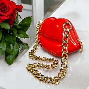 Olivia Miller vibrant, cherry red, jelly feel, lip-shaped clutch/ makeup case with removable thick gold chain. Two zip closure.