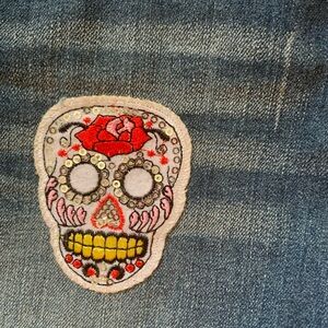 Xhilaration Girls Blue Jean Short With Rhinestones and Skull Decal. Decal was added on for decoration.