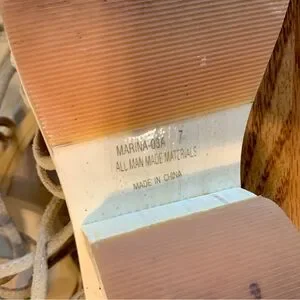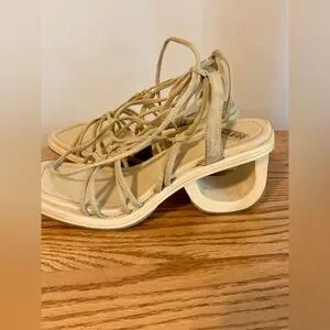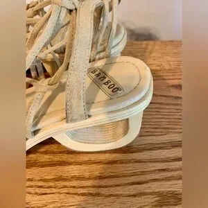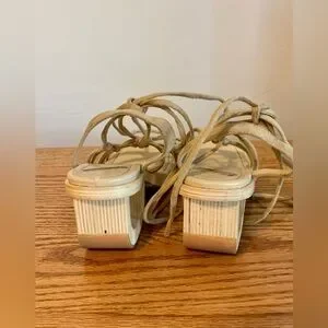 VTG y2k Bamboo Cut Out Heels Wrap Tie Sandal Wedge Wood Suede 7 2000 90s Chunk