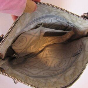 Bag is in great pre-owned condition, minimal wear on the fabric, rubbing on the silver hardwear which removed the silver finish in spots. Inside is very clean lots of pockets/card holders. Adjustable Brown metallic crossbody strap