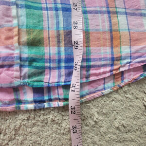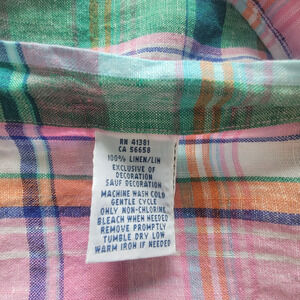 Ralph Lauren men’s short sleeve button down shirt, size Large. Lightweight linen in multicolor madras plaid. Classic preppy summer style.