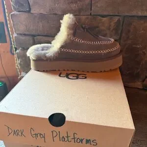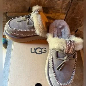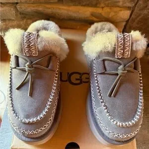 Warm and stylish moccasin-like slippers by UGG. Features plush shearling lining. 1.5" platform, lightweight. Color is Thunder Cloud. I've only tried then on, never worn. NIB