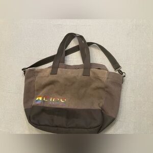 Grey canvas tote bag with rainbow Figs logo. Durable canvas body with waterproof nylon bottom. Two should straps with longer cross body strap option. Bag is 16 inches long, 13 inches deep and 8.5 inches deep. Holds everything you need for a shift and spacious enough for extras.